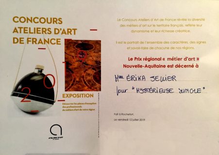 En 2019 elle est lauréate  dans la catégorie"METIER D'ART" du concours organisé par les ATELIERS D'ART de FRANCE avec un grand triptyque en peinture inversée  sur verre dont le fond est enrichi de feuille d'or et d'argent.