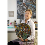 Ses inspirations variées animent de grands panneaux muraux pour la décoration intérieure sur mesure, des pièces uniques d'arts de la table, des crédences de cuisine, des sculptures, des bijoux de cristal aux vibrantes couleurs , des ex votos poétiques et ravissants...